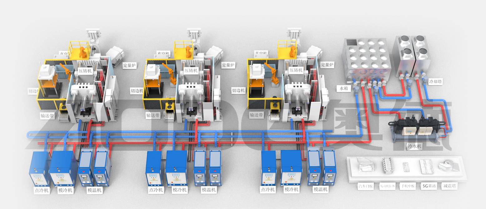2.壓鑄溫控島一站式交付:模溫機,點冷機,模冷機,冷水機,純水機,模具管道清洗機.